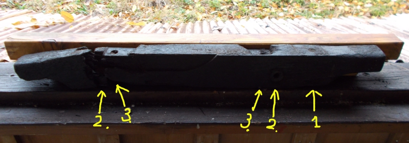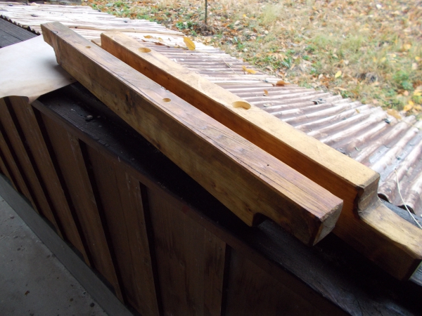強度が落ちた木台を補強するために打ち付けた角材には、