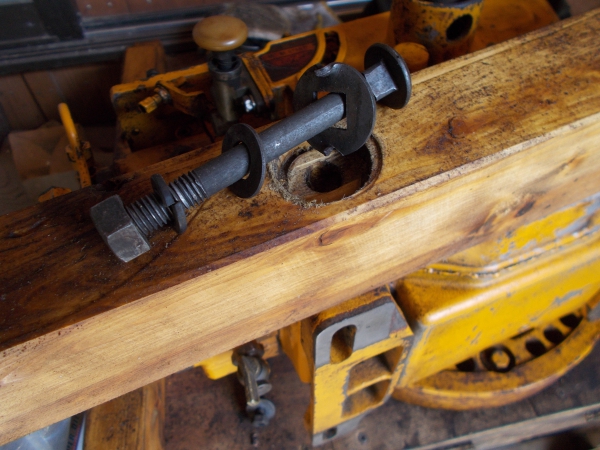 ぐいぐい締め込むと、鍋頭が木台の座繰り穴に入っていくので、平らな場所に